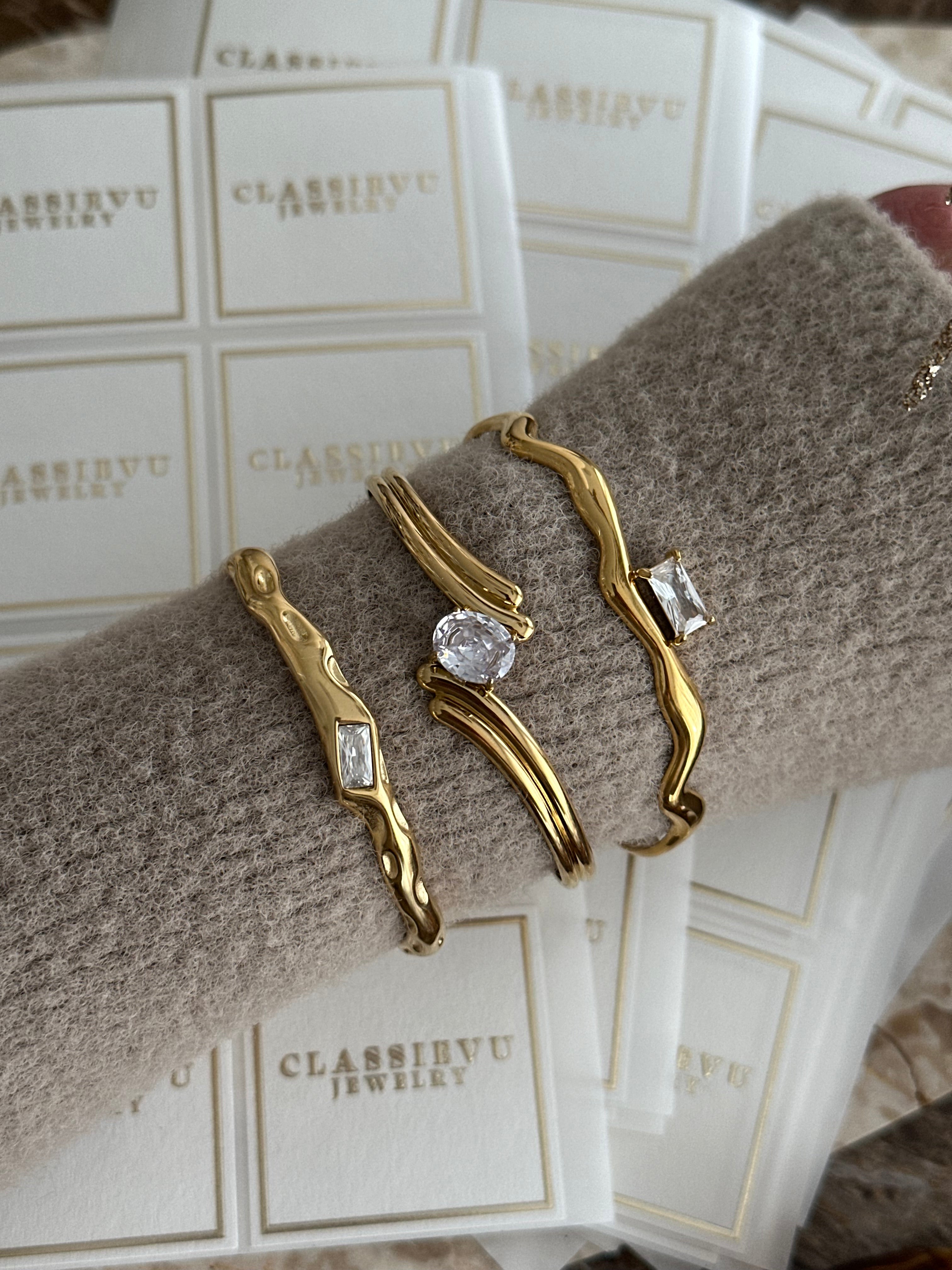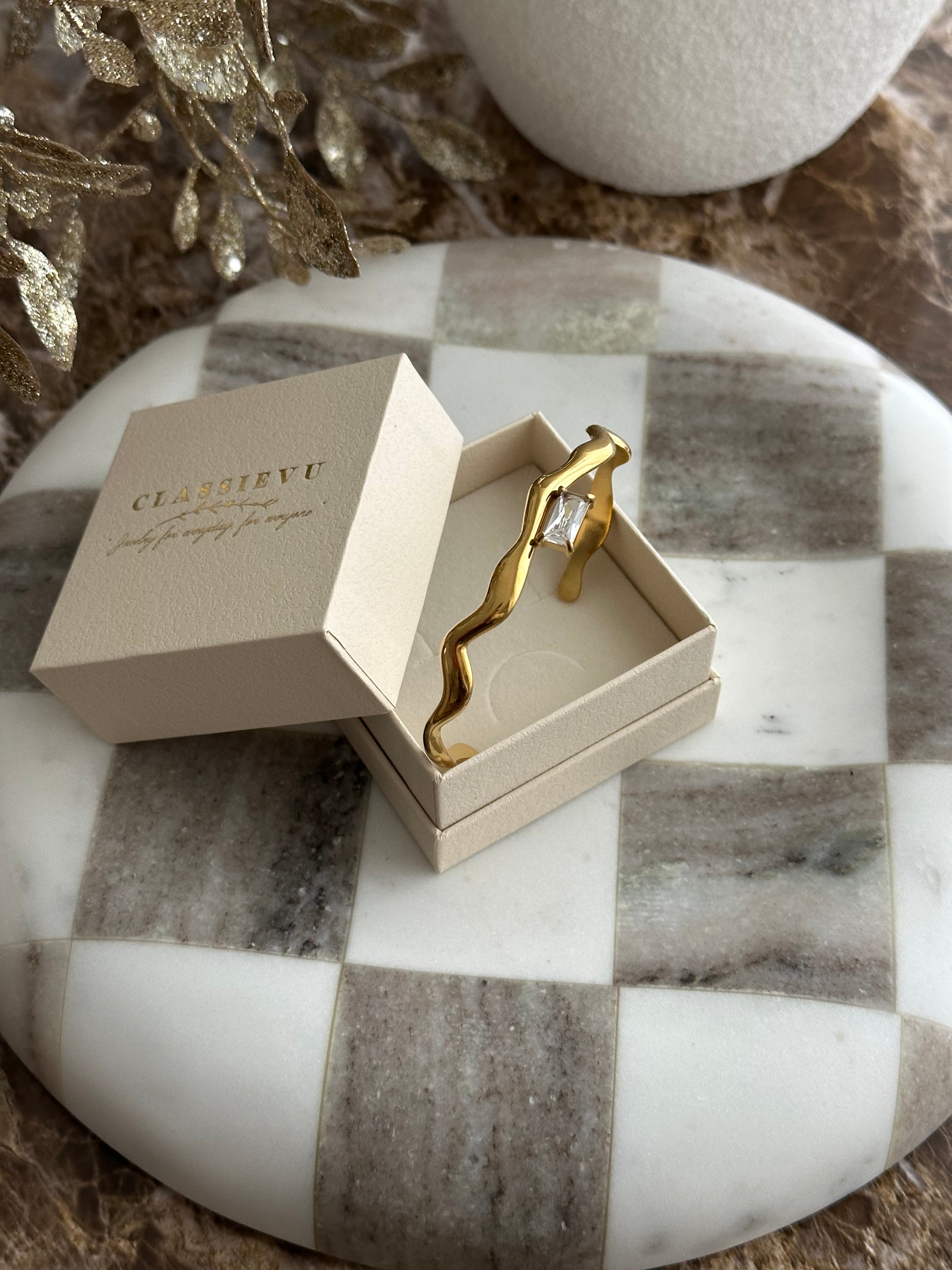 Dieser stilvolle Armreif vereint zeitlose Eleganz mit moderner Vielseitigkeit. Gefertigt aus hochwertigem Edelstahl und veredelt mit einer edlen 14-Karat-Vergoldung, überzeugt er durch seine langlebige Qualität und seinen luxuriösen Glanz.