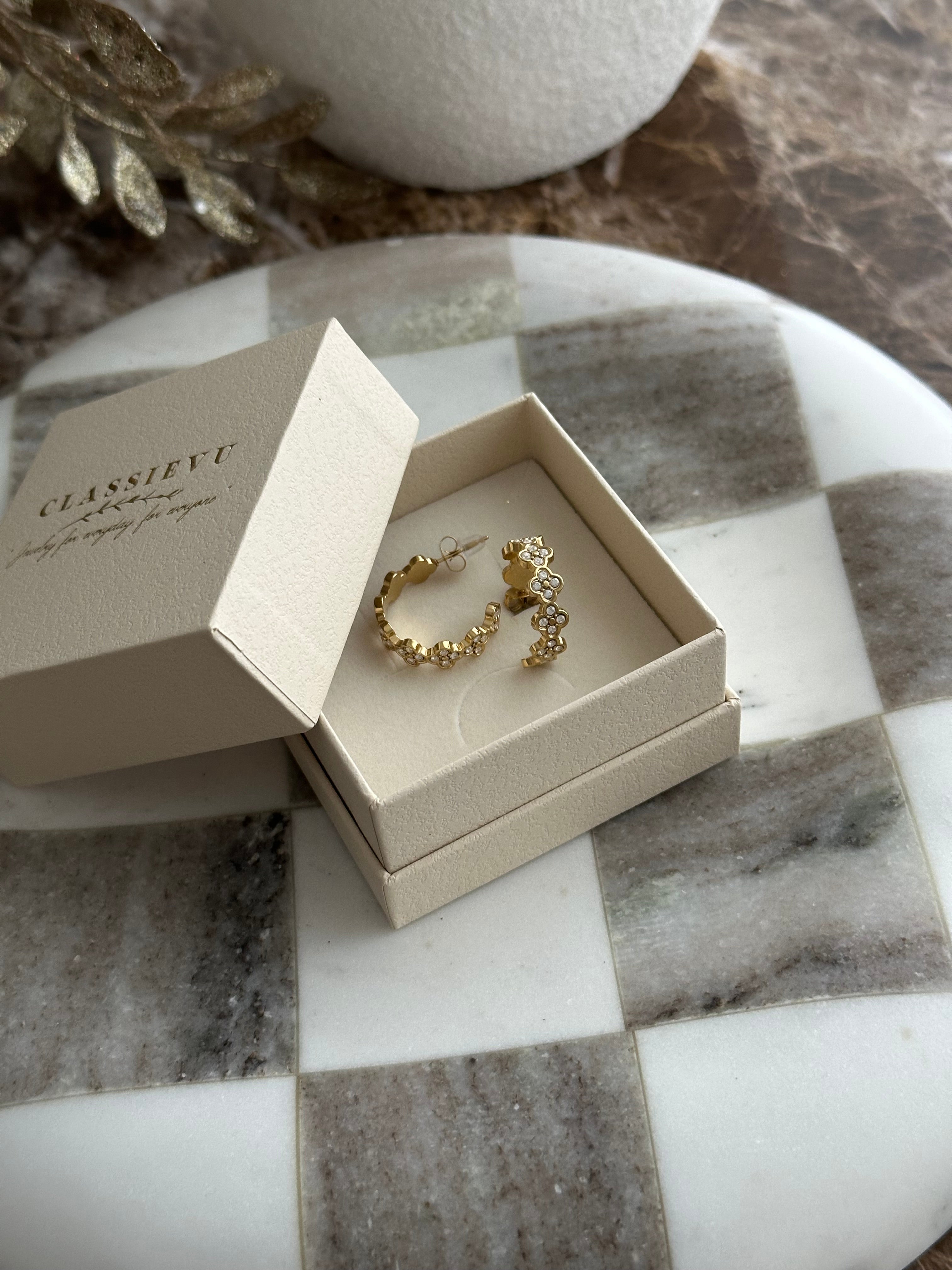 Unsere eleganten Ohrringe vereinen zeitloses Design mit hochwertiger Verarbeitung – perfekt für jeden Anlass. Gefertigt aus robustem Edelstahl und veredelt mit einer 14 Karat Vergoldung, überzeugen sie durch edlen Glanz und besondere Langlebigkeit.